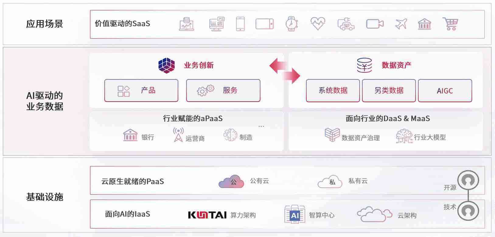 在基础设施层面,,基于商业或开源的云原生就绪开发工具与技术组件(PaaS)和面向AI的底层公共基础设施资源(IaaS),,,,将共同支撑企业完成数字化转型